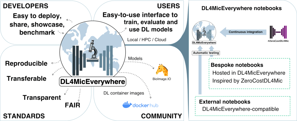 Deep learning has revolutionised the analysis of extensive microscopy datasets, yet challenges persist in the widespread adoption of these techniques. Many lack access to training data, computing resources, and expertise to develop complex models. We introduce DL4MicEverywhere, advancing our previous ZeroCostDL4Mic platform, to make deep learning more accessible. DL4MicEverywhere uniquely allows flexible training and deployment across diverse computational environments by encapsulating methods in interactive Jupyter notebooks within Docker containers –a standalone virtualisation of required packages and code to reproduce a computational environment–. This enhances reproducibility and convenience. The platform includes twice as many techniques as originally provided by ZeroCostDL4Mic and enables community contributions via automated build pipelines. DL4MicEverywhere empowers participatory innovation and aims to democratise deep learning for bioimage analysis.